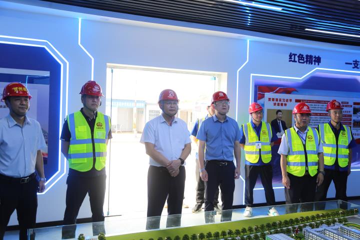 在賀州第三高級中學項目現場,黃俊詳細地觀摩了項目部VR體驗室、項目積分商城、智慧工地展廳、現場安全質量標準化管理樣板間等,對項目的施工工藝、建筑品質、管理水平等方面給予了高度的贊賞。他要求,各參建單位要加大聯動,密切配合,嚴格把控風險,重視工程安全、質量、進度和成本,以工匠精神打造精品項目,高標準、高水平、高質量推動項目建成。